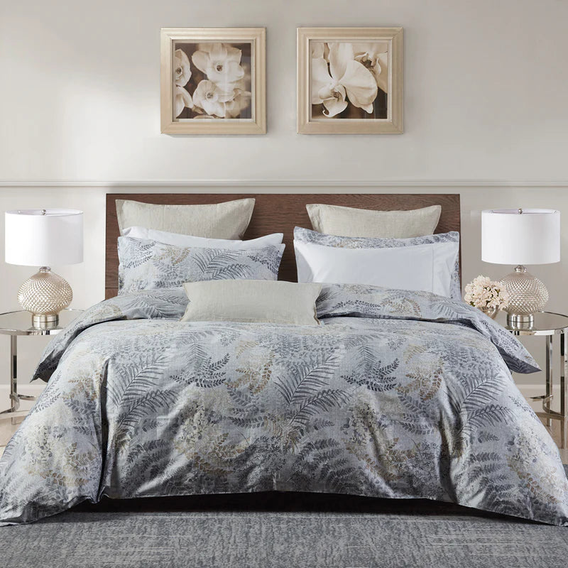 The Ferndale Duvet Cover Set boasts a sophisticated pattern of fronds and fern leaves on a cozy grey backdrop. With accents in golden brown and hints of lavender, this earthy design brings depth to any bedroom. Crafted from 300TC 100% Combed Cotton, it's both soft and breathable for a restful night's sleep. Pair it with our 400 TC Egyptian Cotton Sheet Set and Natural Linen for a truly complementary look.